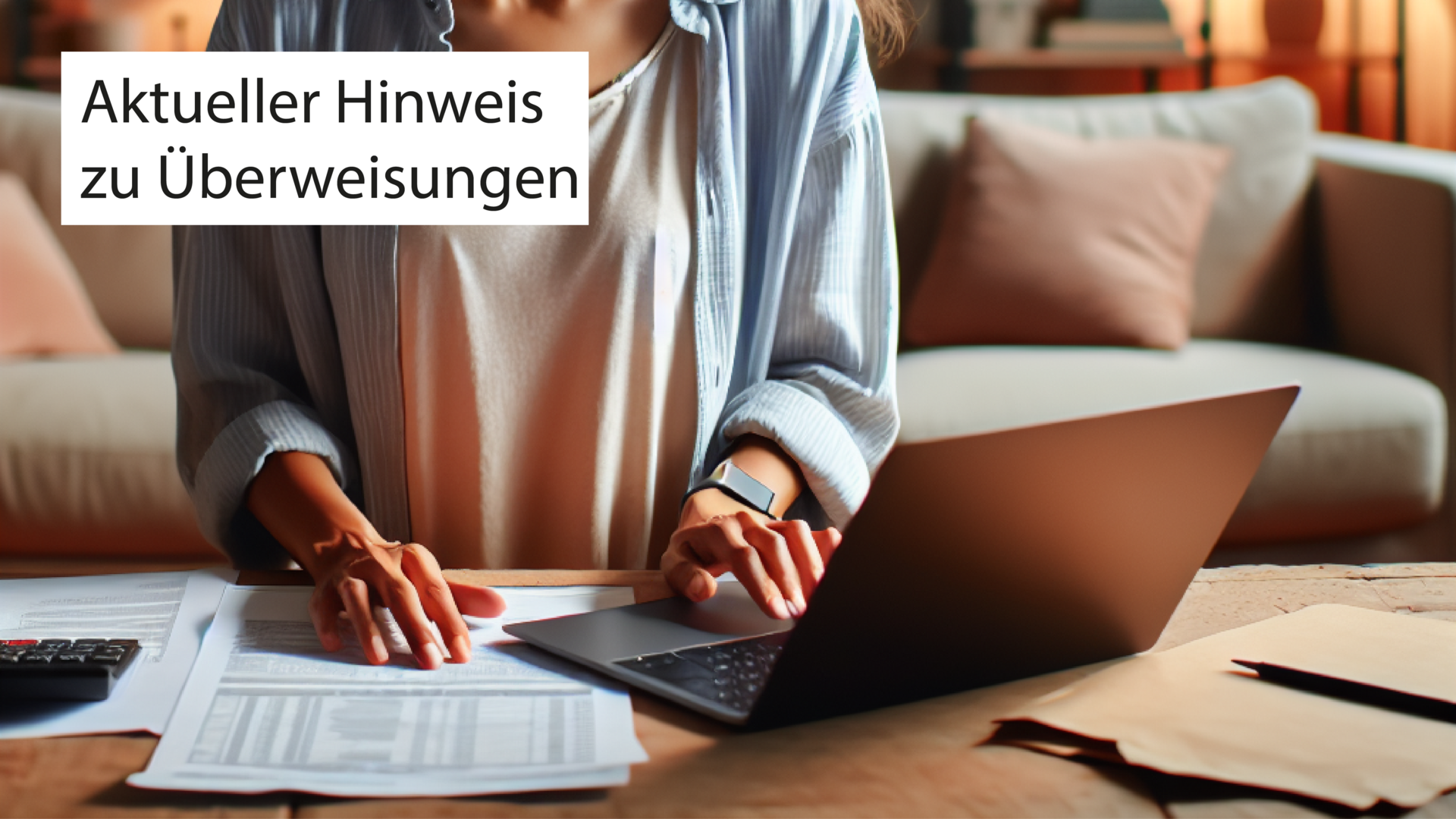 Frau sitzt am Laptop - Text Aktueller Hinweis zu Überweisungen